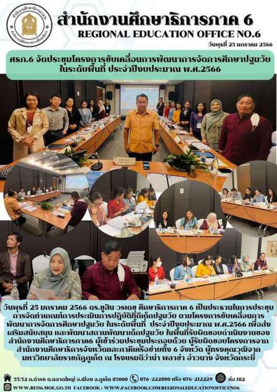 วันพุธที่ 25 มกราคม 2566 นางสาวอาภรณ์ ภู่ดอก รองผู้อำนวยการรักษาการในตำแหน่งผู้อำนวยการศูนย์การศึกษาพิเศษประจำจังหวัดพังงา มอบหมายให้นางสาวกมลวรรณ เดชเจริญ หัวหน้ากลุ่มบริหารงานวิชาการ เข้าร่วมประชุมการจัดทำเกณฑ์การประเมินการปฏิบัติที่ดีเด็กปฐมวัย ตามโครงการขับเคลื่อนการพัฒนาการจัดการศึกษาปฐมวัย ในระดับพื้นที่ ประจำปีงบประมาณ พ.ศ.2566 เพื่อส่งเสริมสนับสนุน และพัฒนาสถานพัฒนาเด็กปฐมวัย ในพื้นที่รับผิดชอบดำเนินงานของสำนักงานศึกษาธิการภาค6 ผู้เข้าร่วมประชุมประกอบด้วย ผู้รับผิดชอบโครงการจากสำนักงานศึกษาธิการจังหวัดและภาคีเครือข่ายทั้ง 6 จังหวัด ผู้ทรงคุณวุฒิจากมหาวิทยาลัยราชภัฏภูเก็ต โดยมี ดร.ชูสิน วรเดช ศึกษาธิการภาค 6 เป็นประธานในการประชุม ณ โรงแรมดีว่าน่า พลาซ่า อ่าวนาง จังหวัดกระบี่ S:0