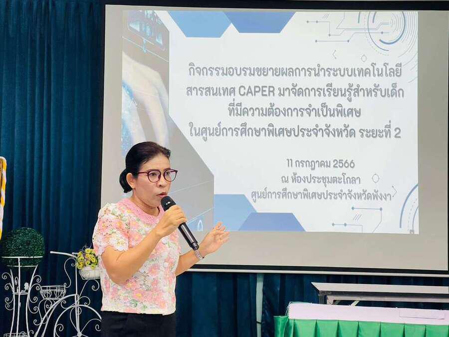 วันอังคาร ที่ 11 กรกฎาคม 2566 นางสาวอาภรณ์ ภู่ดอก รองผู้อำนวยการรักษาการในตำแหน่งผู้อำนวยการศูนย์การศึกษาพิเศษประจำ จังหวัดพังงา พร้อมด้วยคณะครูแกนนำ จัดกิจกรรมอบรมขยายผลการนำระบบเทคโนโลยีสารสนเทศ CAPER มาจัดการเรียนรู้สำหรับเด็กที่มีความต้องการจำเป็นพิเศษในศูนย์การศึกษาพิเศษประจำจังหวัด ระยะที่ 2 เพื่อเป็นเครื่องมือเทคโนโลยีดิจิทัลสนับสนุนการจัดการเรียนการสอน การเก็บผลงานและคลิปวิดีโอการสอนตามระบบประเมินวิทยฐานะดิจิทัล(DPA) ของครู ณ ห้องประชุมศูนย์การศึกษาพิเศษประจำจังหวัดพังงา S:0