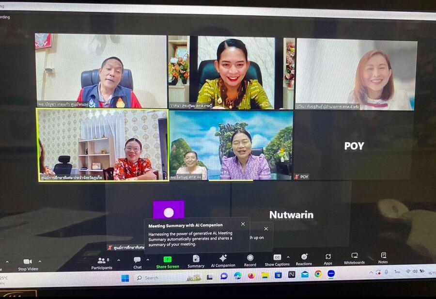 วันพฤหัสบดี ที่ 16 พฤศจิกายน 2566 นางสาวจิตรนุช โคตรดี ผู้อำนวยการศูนย์การศึกษาพิเศษประจำจังหวัดพังงา พร้อมด้วยนางสาวอาภรณ์ ภู่ดอก รองผู้อำนวยการศูนย์การศึกษาพิเศษประจำจังหวัดพังงา เข้ารร่วมประชุมกลุ่มเครือข่ายส่งเสริมประสิทธิภาพการจัดการศึกษา เขตการศึกษา 4 เพื่อปรึกษาหารือในเรื่องการดำเนินงาน กิจกรรมของกลุ่ม ผ่านสื่ออิเล็กทรอนิกส์โดยระบบแอพพลิเคชั่น ZOOM cloud meeting ณ ศูนย์การศึกษาพิเศษประจำจังหวัดพังงา S:0