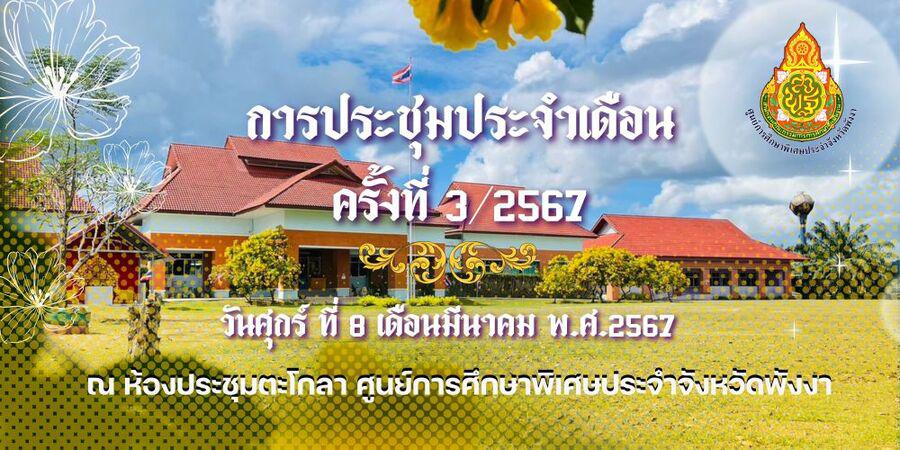 วันศุกร์ ที่ 8 มีนาคม 2567 ศูนย์การศึกษาพิเศษประจำจังหวัดพังงาจัดประชุมติดตามผลการดำเนินงานเดือนกุมภาพันธ์ 2567 ครั้งที่ 3/2567 นางสาวจิตรนุช โคตรดี ผู้อำนวยการศูนย์การศึกษาพิเศษประจำจังหวัดพังงา มอบหมายให้นางสาวอาภรณ์ ภู่ดอก รองผู้อำนวยการ เป็นประธานในการประชุม ผู้บริหาร คณะครูและบุคลากร เข้าร่วมประชุม สรุปรายงานผลการดำเนินงาน โครงการต่างๆ ของเดือนที่ผ่านมา และวางแผน ชี้แจงการดำเนินงานในเดือนต่อไป ณ ห้องประชุมตะโกลา ศูนย์การศึกษาพิเศษ ประจำจังหวัดพังงา S:0