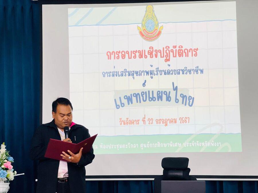 วันอังคาร ที่ 23 กรกฎาคม 2567 นางสาวจิตรนุช โคตรดี ผู้อำนวยการศูนย์การศึกษาพิเศษประจำจังหวัดพังงา มอบหมายให้ นายพงษ์พิทักษ์ ศรีสุขคำ รองผู้อำนวยการ และคณะครูนักสหวิชาชีพ จัดโครงการบูรณาการการจัดการศึกษาด้วยภูมิปัญญาท้องถิ่น กิจกรรมแพทย์แผนไทย เพื่อพัฒนาศักยภาพในการจัดการเรียนการสอน ให้กับบุคลากรทางการศึกษาของศูนย์การศึกษาพิเศษ ประจำจังหวัดพังงา ณ ห้องประชุมตะโกลา ศูนย์การศึกษาพิเศษประจำจังหวัดพังงา S:0